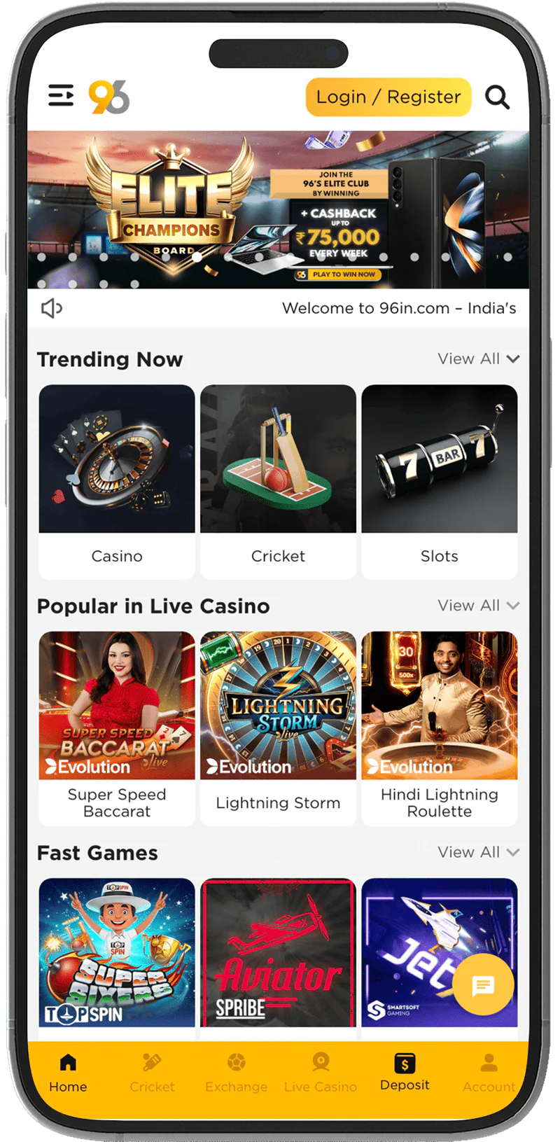 Through the 96in Aviator App, users get access to all types of services, not just crash games. To start betting in 96in Aviator, you need to: