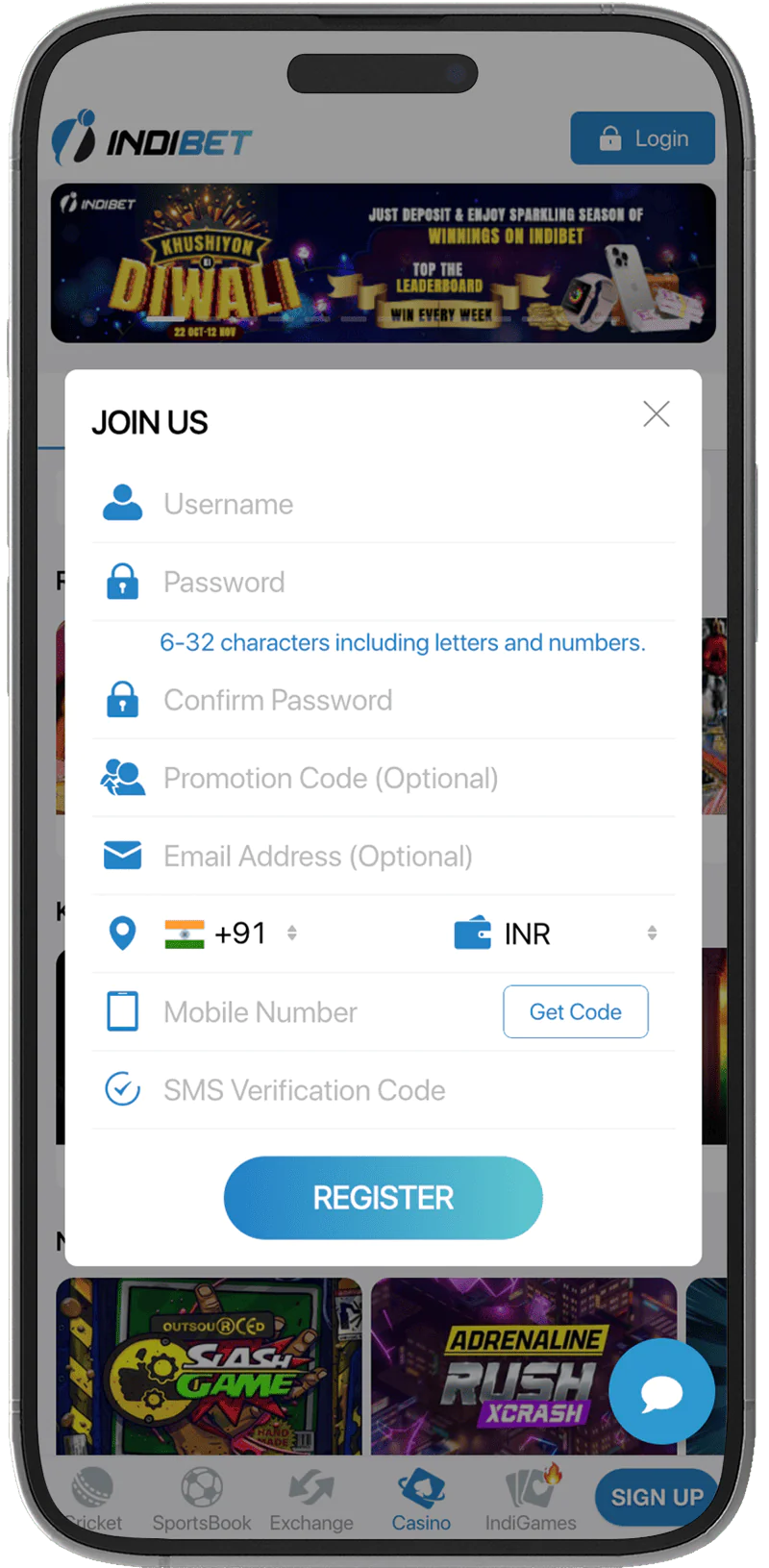 - Once installed, find the Indibet app for Android on your home screen and tap to launch it. Register an account or log in if you have one already.