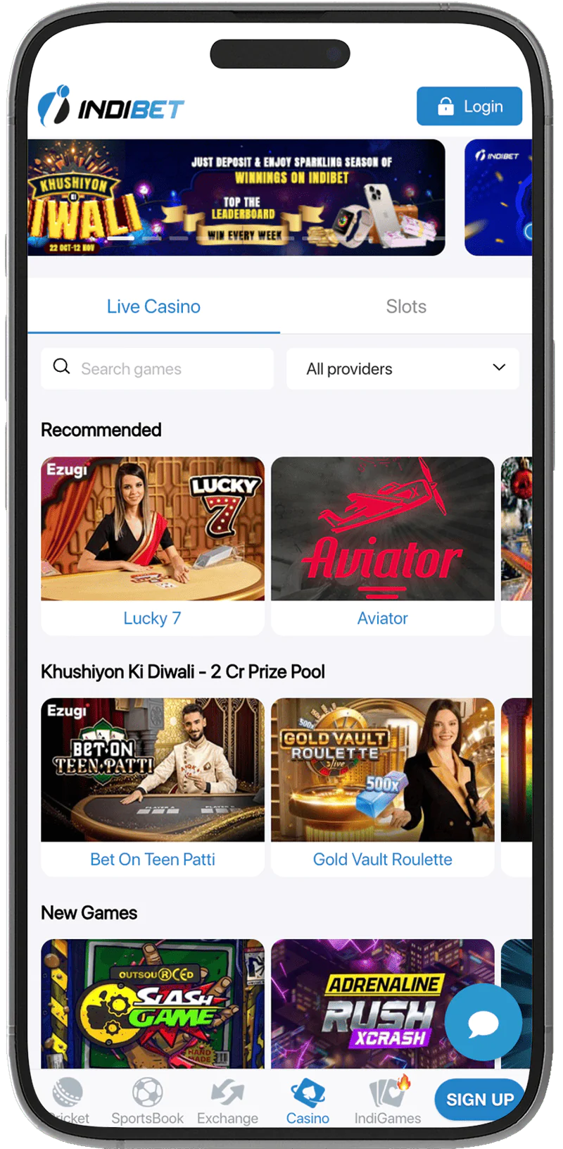 Open the Indibet Aviator game app. Once inside, you’ll start at the home screen. From here, go directly to the Casino page, which houses numerous games.